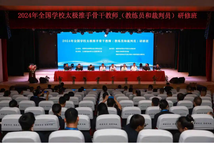 为贯彻落实《深化体教融合促进青少年健康发展意见》等文件精神,传承和弘扬优秀传统文化,发挥学校教师在太极推手普及推广中的引领作用,推进太极推手在全国学校武术教学的发展,促进太极推手骨干教师队伍建设,2024 年 7 月 6 日,一场备受瞩目的全国学校太极推手骨干教师(教练员和裁判员)研修班活动在南通经济技术开发区实验小学教育集团龙腾校区隆重拉开帷幕。来自全国各地的骨干教师们齐聚一堂,共同探讨太极推手的奥秘与精髓。