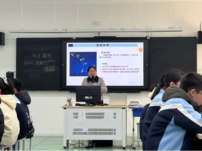 龚春美老师执教了《北斗指引——AIGC赋能python语言库的学习》,本课以科普版地理七年级《观测北斗七星》为情景线索,融入数学中平面直角坐标系,学习python语言库中的海龟模块绘制北斗七星图。教学中以学习单为载体,引导学生完成学习过程,以读懂简单几何图形的绘制代码,引出如何绘制几何图形组合的综合画面图的程序,进而提出人机协作共同编写代码的学习方式。学生和生成式人工智能(AIGC)对话的过程中,了解AIGC编写程序以及其运行代码的效果。